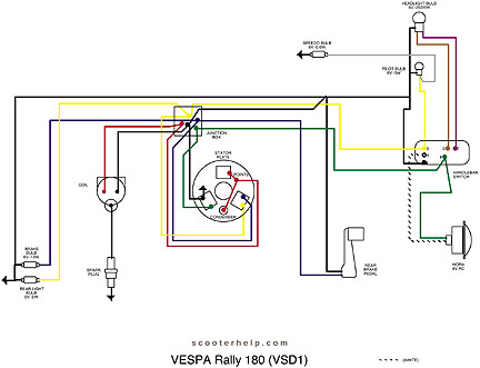 Electrical Diagram VSDITclick image to download a .pdf file[without battery][with battery] Thanks to Derek from First & Last Chance Scooter Club for the battery diagram. You can also scroll down to see the wiring diagrams for the German Rally 180 models thanks to Peter |