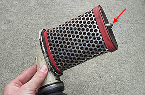 The filter and intake will now pull out sideways from the air filter box. Sometimes the rubber gasket gets old and sticky and may need to be replaced (like it should be here). There is a wing nut on the inside face of the filter assembly which needs to be removed to change out the filter itself. Once this is done, the filter will slide off the central bolt and can be discarded. Check the flexible rubber hose for any cracks or breaks that might allow dirt into the clean air supply.