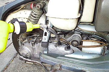 Lambretta Gearbox Oil ChangeA two stroke engine lubricates itself in two separate ways. The gearbox, clutch, and drive is lubricated by standard gearbox oil. There is no oil pump. Instead, the gears running in the oil manage to pass enough oil around the gearbox to lubricate it properly. Gearbox oil in a scooter should be changed about every 3000 miles with new ST 90 gear oil, which is the same as SAE 30 motor oil. For some reason oil manufacturers have different viscosity definitions for motor oil vs. gear oil. This is a constant cause of confusion when buying transmission oil for your scooter. If in doubt remember that oil for car engines is crankcase oil and oil specifically for scooter transmissions is gear oil. Below are directions for any Lambretta series I through III.