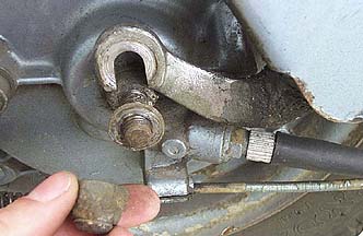 Once the axle nut has been removed, there is a washer on either side which fits into a recess in the fork link. Sometimes these are a little tough to remove so they must be pried loose with a screwdriver or pliers.