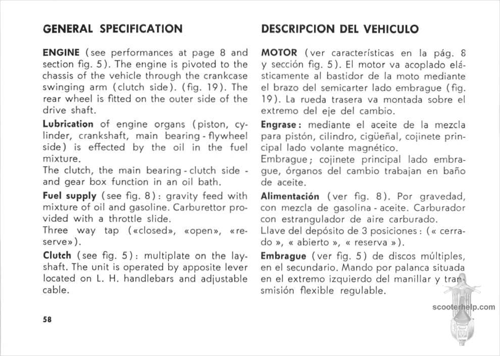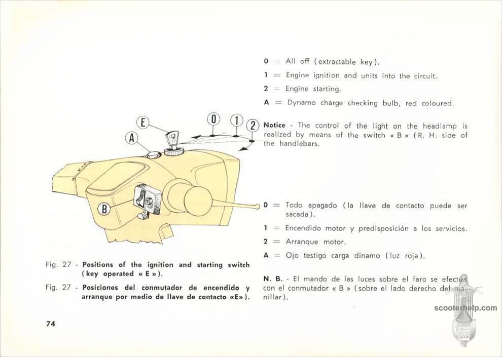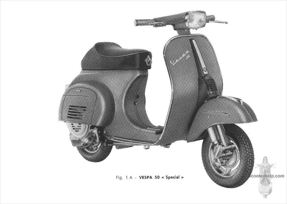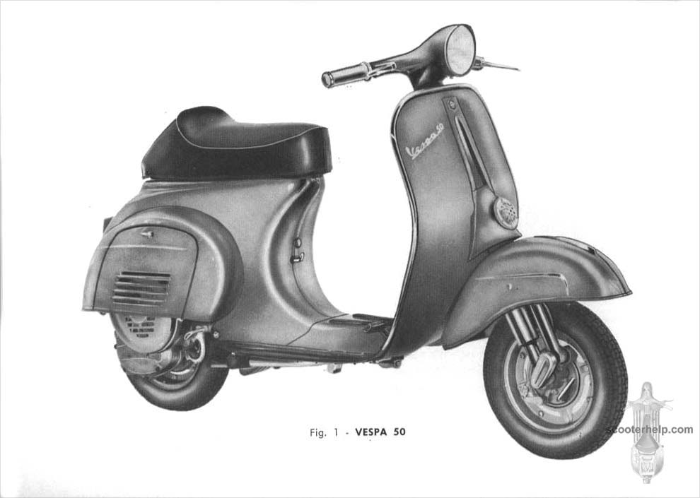 Vespa 50 (V5A1T) & 50 Special (V5B1T) and electric start version Owner's ManualClick individual pages below for a 6.75"x4.75" 150 DPI page. Taken from the original owner's manual supplied with the Vespa 50. Files sizes are about 250K for a color page and 180K for a black and white. Thanks to ?? Click individual pages for images or here for a 6.2MB PDF file. |