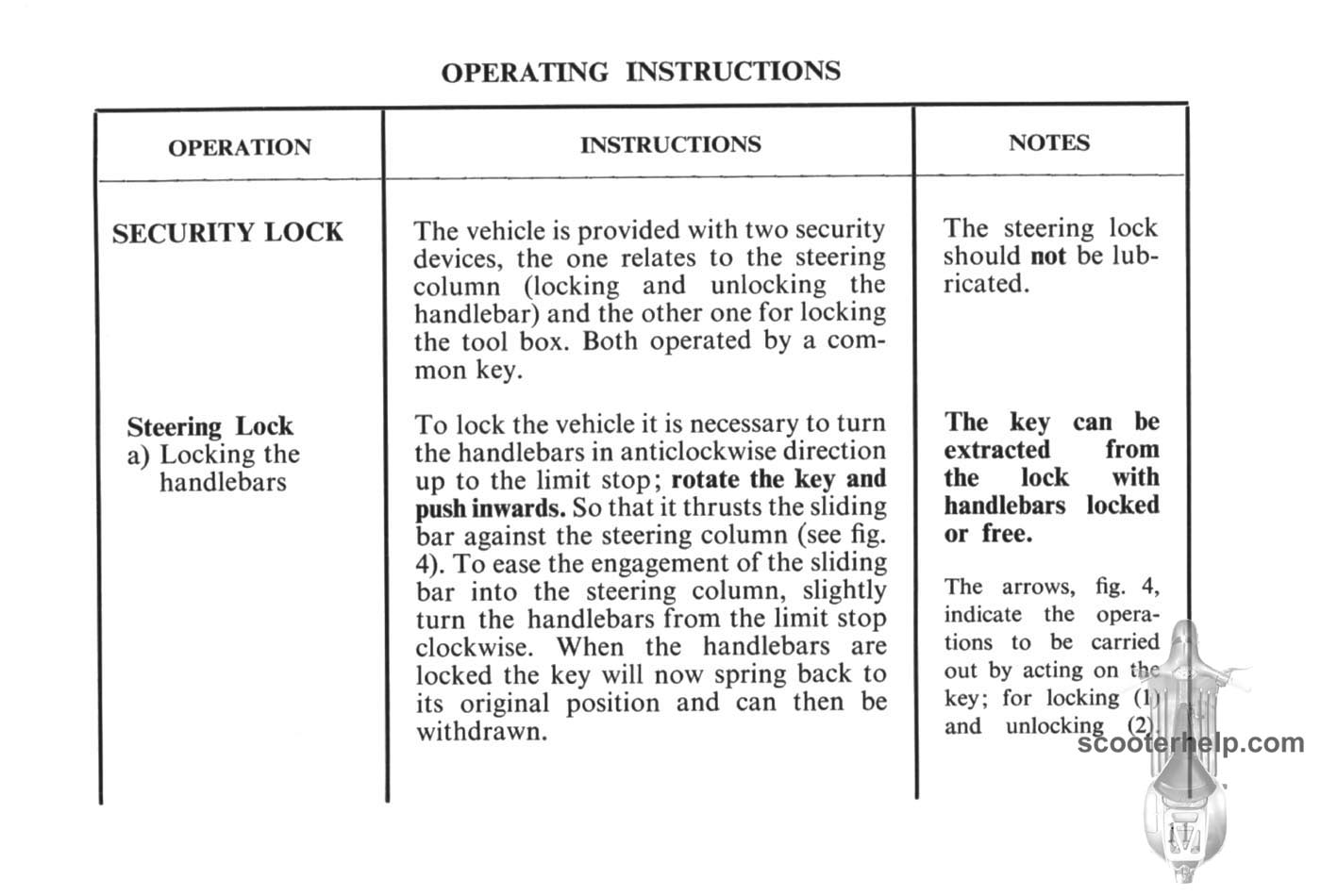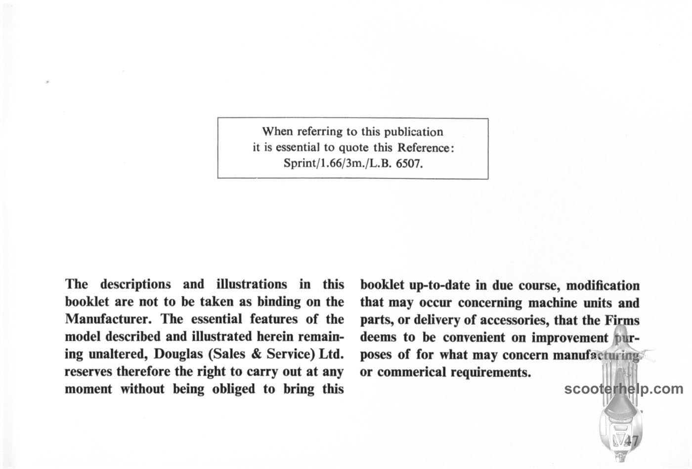 Vespa 150 Sprint (VLB1T) Owner's ManualClick individual pages below for a 7"x4.75" 200 DPI page. Taken from the original owner's manual supplied with the Vespa Sprint 150. Files sizes are about 250K for a color page and 180K for a black and white. There is no page 43 (it's a blank page) so it has been left out. |