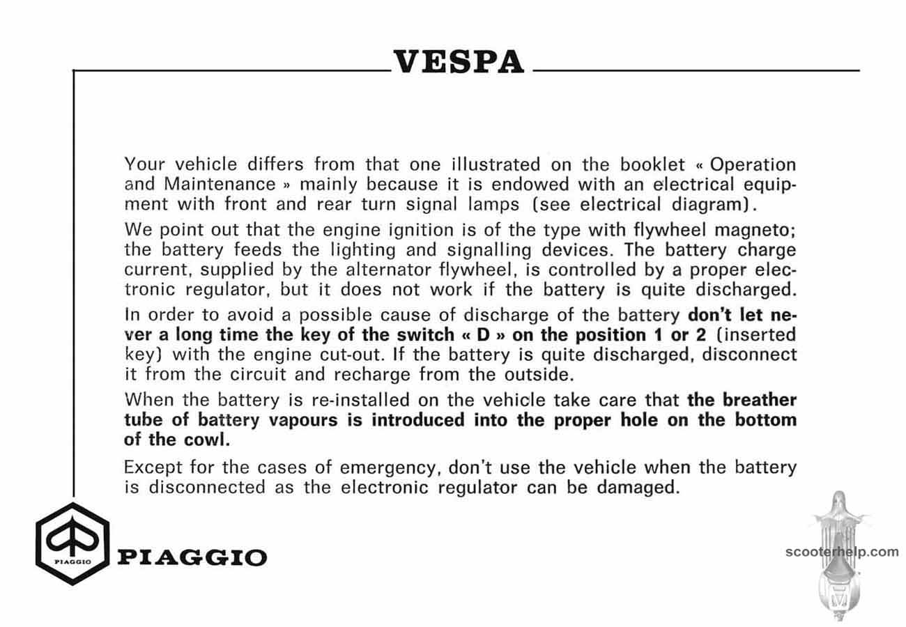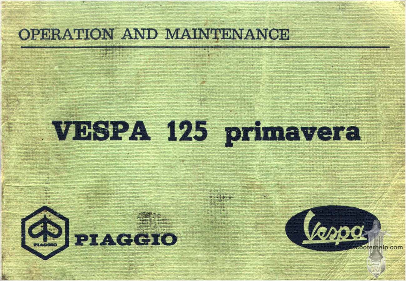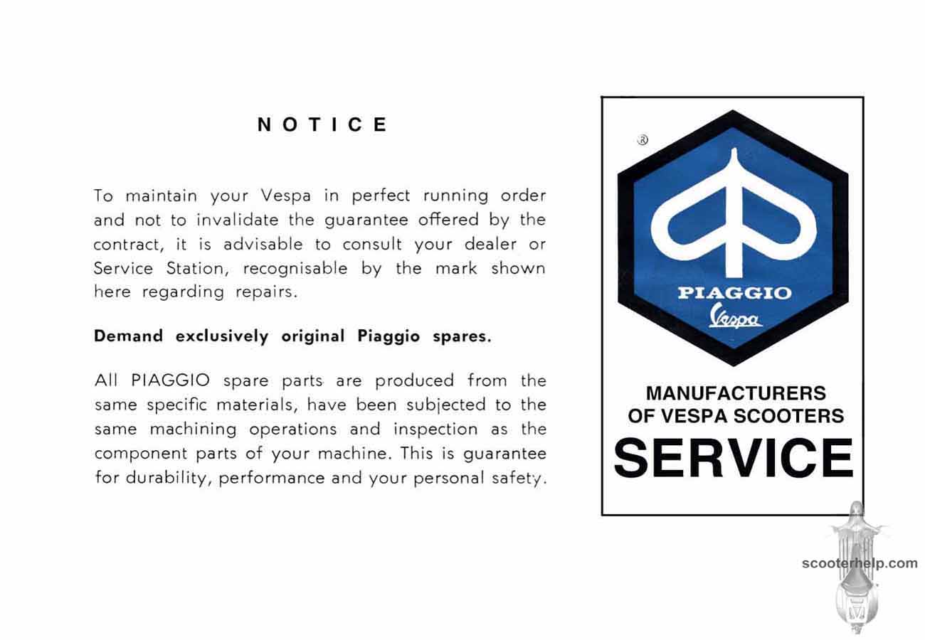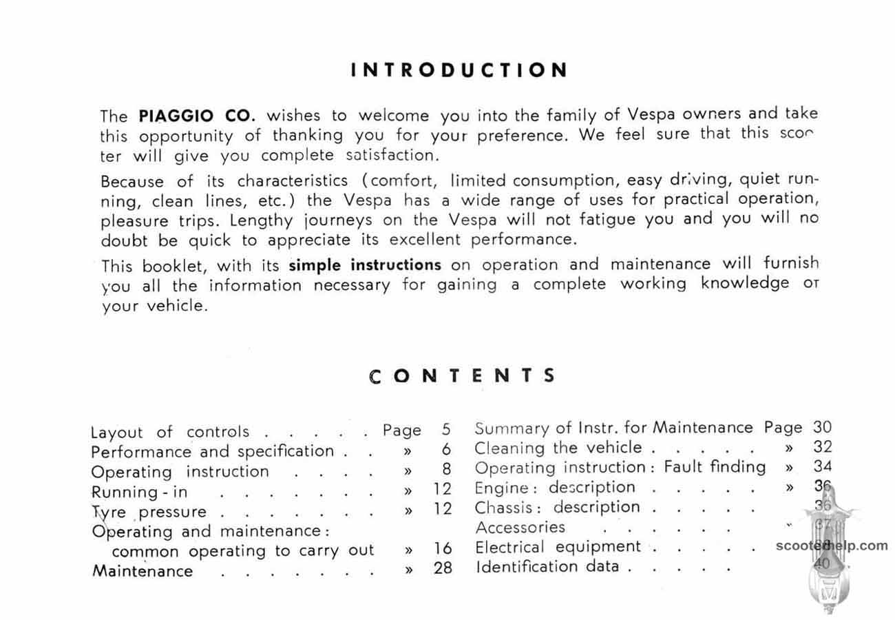 Click individual pages below for a 6.75"x4.75" 200 DPI page. Taken from the original owner's manual supplied with the Vespa 90. Files sizes are about 250K for a color page and 180K for a black and white. Thanks to Eric Dupraz for the scans.