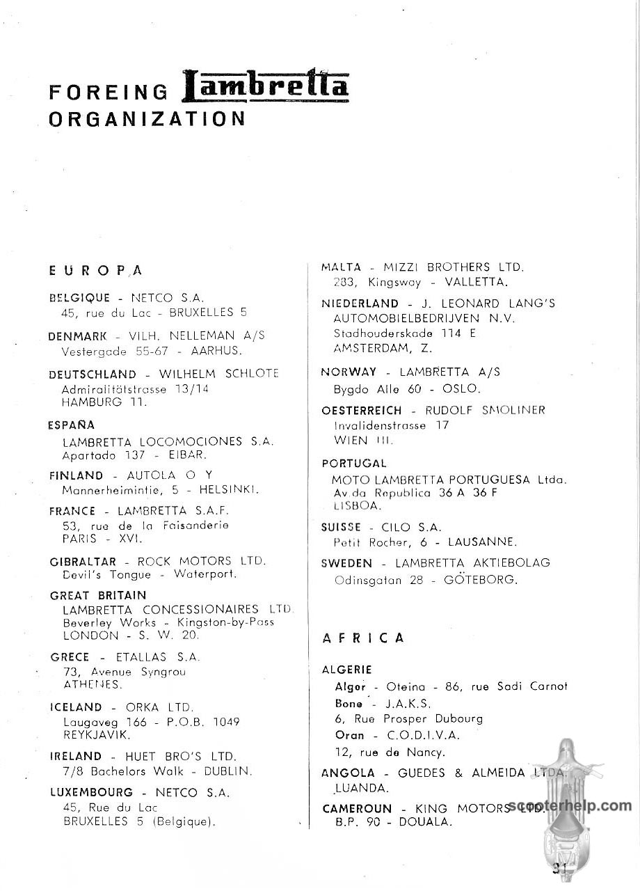 Lambretta Li 125 Series II Owner's ManualClick individual pages below for a 6x4 1/4" 200 DPI page. Thanks to John Macklin for the original scans. Files sizes are about 200K for a black and white. If you prefer a .pdf file of all the pages click here for a 5MB file download. |
