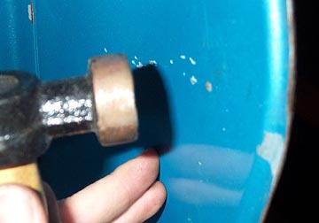 Using a hammer and steel block, carefully mushroom the end of the soft rivet. The steel block should be held tight against the head of the rivet while you carefully tap from the inside. The soft rivet will flatten out and firmly hold the badge in place. Next Section --> |