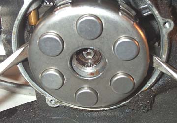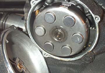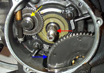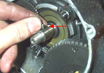 Once removed be sure to either remove the woodruff key (red arrow) in the crank or tape it in place. There is nothing worse than one falling into the gearbox making an hour long clutch replacement turn into a full rebuild (sorry for the blurry picture). Next Section - - > |