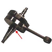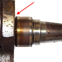 An internal race must also be fitted to the flywheel side taper of the crank. This is an easy item for the scooter shop to fit when the crank is bought but it can also be installed with a large deep socket or correct diameter metal tube. Heating the race with a blowtorch makes installation very easy. Using the tube or socket slide the race down until it stops. At this point, lightly tap the bearing race on the crank. Heating the race will aid in this process. Make sure that the flywheel side crank web is fully supported or you will put stress on the crank pin and possibly distort a nice new crank. This race should not touch the flywheel, but be spaced of by about 0.5mm. Below is the race location on a new crank and the clearance on a dead crank.