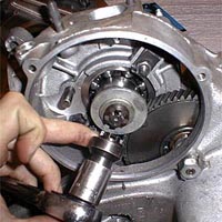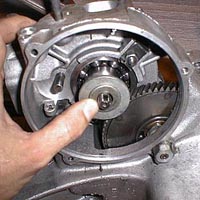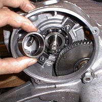 This section assumes that you have already split the casings and removed the old crankshaft from the main bearing. These pictures are all from a P200E engine and older models have a different bearing set up.