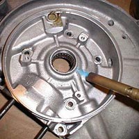 Purchasing a new crank is pretty easy. Most scooter shops have them in stock and can fit the flywheel side race noted below for a small price. It is wise to change both crank bearings located in the crankcases if there is excessive play. The main bearing on the clutch side can be removed by taking off 2 nuts and tabs and a retaining clip visible once the oils seal is removed. It can then be driven out with a large socket of equal diameter to the outside race. European or non-autolube models have a large retaining clip instead of the tabs. The flywheel side bearing has 2 parts - an internal race which is tightly fitted to the new crankshaft and a caged needle bearing set into the flywheel side casing. To remove the casing side of the flywheel bearing remove the flywheel side oil seal (which should also be replaced), and gently heat the casing with a blow torch, shown below.