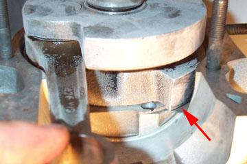 Above is a shot of the crank correctly seated. The important part to note is that the crank web lip fully seals and unseals the intake hole in the casing. Make sure the lip of the crank web drops down into the groove in the casing. If you look at the shoulder of the crank against the clutch side of the main bearing it may not be totally flush, but as long as the lip is in the groove the crank is well installed. The crank is all furry with ice condensation because it was frozen before I installed it. If you use this method and don't plan to use the engine the same day as the rebuild, spray the crank with WD40 so the ice doesn't melt and start to rust the crank or bearings.