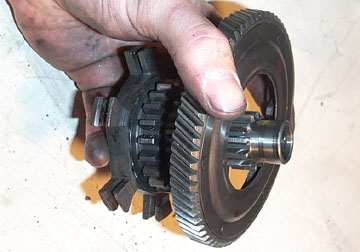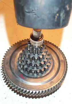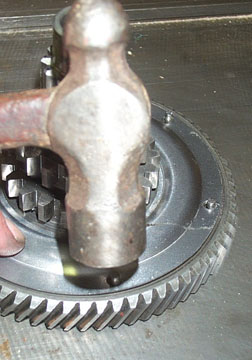 Support the primary drive above a flat work surface so that the central shaft is not touching the surface. Using a rubber mallet or hammer and wood block, start tapping the shaft down through the gear cluster.