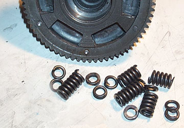 The cush drive repair kit consists of a new backplate (flat) a new front plate (with a bevel), six new outer springs (for 125 and 150cc engines), six inner springs (used in conjunction with the larger springs on 200cc bikes), and six rivets.