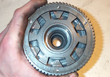 Above is a shot of a primary drive input shaft taken from a PX150. The cush drive is located in between the two metal plates which are held together with rivets. In order to determine if the springs are shot you can sometimes tell by shaking the entire assembly. If you here rattling they are definitely gone and need replacing.
