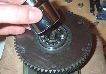 Then support the primary drive with equal sized blocks of wood on either side and use a socket large enough so it only touches the outr race of the new bearing, and hammer it home.