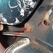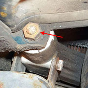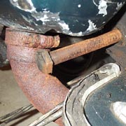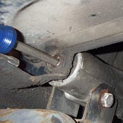 If you have really nice paint work it is advisable to put a rag between the cylinder and the frame, and another between the top of the muffler and the frame before removing the pivot bolt. To remove the pivot bolt I like to use a large flathead screwdriver. I have found that if you just pull the bolt out the engine starts to lean towards the left of the bike and makes it harder to get it out. It is much easier to have the engine lean to the right instead. To make this happen I drive the bolt through with a screwdriver and hammer. This way when the threaded end is pushed through the frame, the screwdriver takes the weight. I then use the vice-grips to pull the bolt out at the engine side.