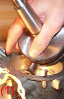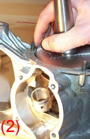 (1) Turn the crank to bottom dead center so that the crank pin is furthest from the crank mouth. (2) Bring the crank down at an angle so the small end of the con rod fits through the left side main crankcase transfer. (3) Align the drive side of