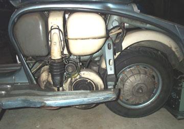 Remove the 24mm nut and washer on the upper and lower shock mounts. Once removed you may find that the shock is hard to get off. The trick is to pull each end just a small bit at a time so it comes squarely off the mounting posts. Once off the rear wheel will be able to hit the inside of the rear mudguard.