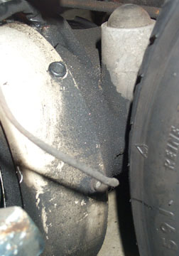 Remove the single fan shroud bolt that holds the ground wire in place just in front of the rear wheel. This completes all the left side disconnects, and we can move on to the right hand side.