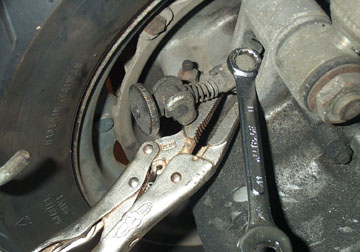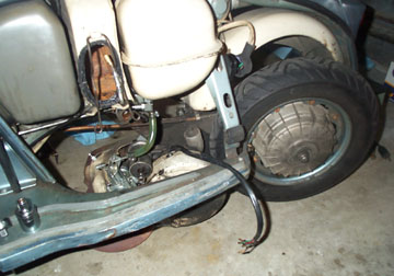Find the rear brake adjuster just inside the rear hub. You can either disconnect the rear brake at the foot pedal under the floorboards, or remove the adjuster from the end of the cable as I did.
