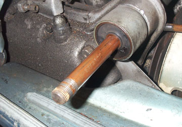 Only one nut needs to come off but the pictures show both nuts removed. Using either a punch to the center of the bolt, or a block and hammer start pounding the pivot bolt out of the engine mounts. The block or punch is used so that the threads are not damaged. Once the bolt is flush with the mount I like to use a flathead screwdriver and hammer to keep pushing the bolt through. This is a nice trick because once the first mount is free the screwdriver will not allow the engine to completely drop out.