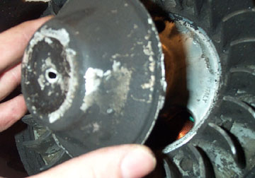Once the shroud is removed the center cover and the flywheel are visible. The center cover is held in place by a wire retaining ring. Squeeze the two ends together and the ring can be removed.