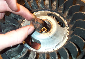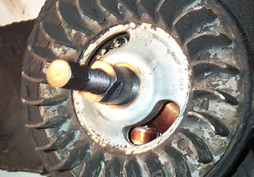 Carefully thread the puller in place. Be sure to get it nice and deep in the bore so that you have more thread to pull against. Sometimes it is necessary to use the flywheel holding tool to get the puller nice and deep.