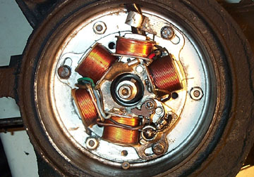 With the flywheel out of the way the stator is accessible for maintenance or replacing entirely. Next Section --> |