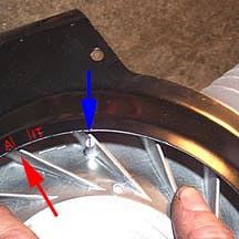 Once the flywheel is off, loosen the 3 stator screws with a Phillips head screwdriver. These just need to be loose enough for the stator to turn by hand. If the timing marks you checked before showed the flywheel mark out of alignment by being too far counterclockwise (left), the stator needs to be rotated to fire the spark plug closer to top dead center (TDC) so it will be need to be turned clockwise and visa versa. In two stroke language if you move the stator to allow the spark to fire closer to TDC you are "retarding" the igntion - if you move it to fire further away from TDC it is called "advance".The amount it needs to be moved is about the amount that the timing marks are off by. Once you have made the move, tighten the three screws, reinstall the flywheel, washer, nut and tighten it down. If you have a P200 you do not install the fan cover as it makes the inspection hole and alignment marks hard to see when checking with a strobe. If you have a PX200, reinstall the flywheel fan cover so that the fan cover marks align with the flywheel line. Keep repeating this process until the marks line up.