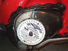 With the degree disk in place you can now start the process to find top dead center (TDC). You may need to cut some access holes in the degree disk face so that you can reach the inspection hole in the flywheel.