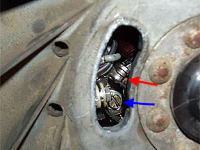 Next you need to make a pointer. An easy way to do this is cut about a 2-3" length of wire or an old coat hanger and bend it a hoop in one end. Bend the other end so that when it is mounted to the casing with a fan cowl screw, it will point accurately to the timing disk (see above).
