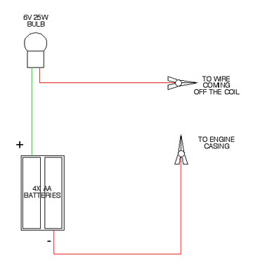 Checking the timing: It is necessary to check the timing of the motor because the points must separate exactly at the BTDC point or the engine will run badly. To do this there are two methods: Statically with use of a small testing circuit or dynamically with a strobe light. Static Method: For