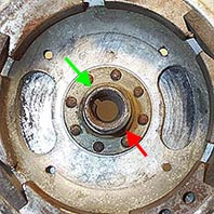 The cam on the flywheel can be seen above. It is very slight and (maybe) you can see that the side with the red arrow has a thicker wall than the side with a green arrow. When the contac breaker arm rides up on this fatter part the points are pushed open.