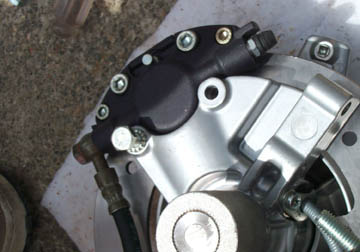 Now the caliper can be reattached with the two bolts with slip washers. If the caliper will not fit over the width of the disk, you can carefully force the caliper more open with a flat head screwdriver. The hydraulic line should exit the caliper as shown above and the remote master cylinder can just be left hanging fro the moment.