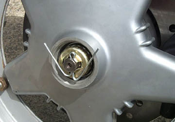 ...followed by a new split pin to stop the nut from loosening while the bike is in motion. The ends can be bent further to allow the small hub cap to go on over it.