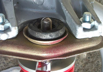 Push the top of the shock through the mounting bracket, fit the dished washer, followed by another rubber ring.