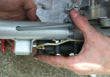 Here's a shot from above showing the speedo cable exiting the lower hole and the master cylinder bolted in position.