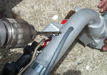 The only problem with the 20mm forks we bought was that they are designed to have a hydraulic line that comes off the frame not running down the center of the forks like a typical front brake cable would be run. Because of this we had to drill another hole for the front brake cable. Make sure you drill it at an angle as shown above.