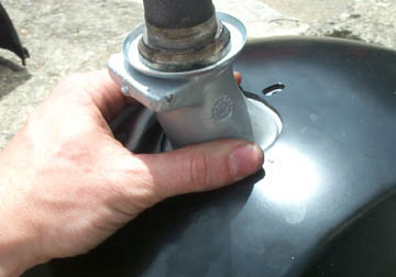 The top and bottom end of the front shock is the only thing that stops the back plate from rotating. At the top end, fit the metal retaining plate to the forks with two bolts, nuts, and split washers. The top of the shock has a single rubber ring as shown above.