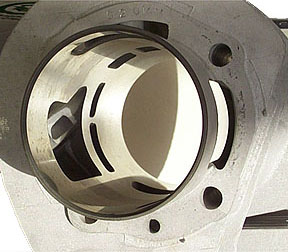 The most obvious thing about the kit is it is all ports! There is barely a 1/4" of the circumference at bottom dead center that is not open to the transfers or the exhaust. Seven ports total vs. the 3 standard ports in a Vespa barrel. The piston rings are pinned either side above the main transfers. Below is a shot of the transfers from the head.