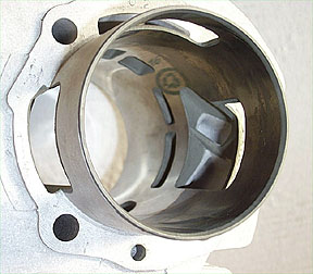 The bottom of the barrel is equally as different as the port layout. The three transfers are larger than standard and take place both in the crankcase and the barrel. The photos below show the large main crankcase transfers which split into two smaller ports in the further up the barrel bore.