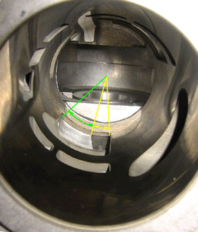 Updated - Below is a shot of the transfers now lining up after the cases were ported. The yellow represents the original transfer, and the green represents the area that was blended with the barrel transfer to allow the gasoline to pass more freely. Compare it to the above shot to see the difference.